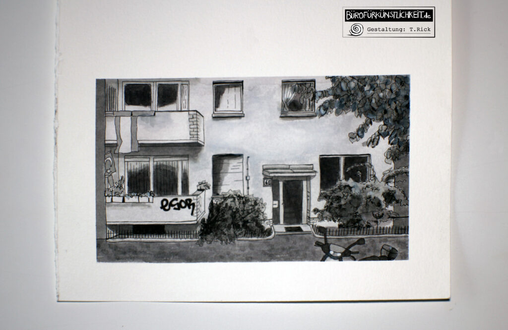 Du hättest gern ein gezeichnetes/ gemaltes Bild von einem für Dich wichtigen Ort? T.Rick hat als Bühnenbildmensch ein besonderes Interesse an Räumen und freut sich über so einen Auftrag. Hier die von T.Rick malerisch verewigte Ansicht eines Hauses in Berlin-Kreuzberg (Wrangelkiez), das heute nicht mehr steht.